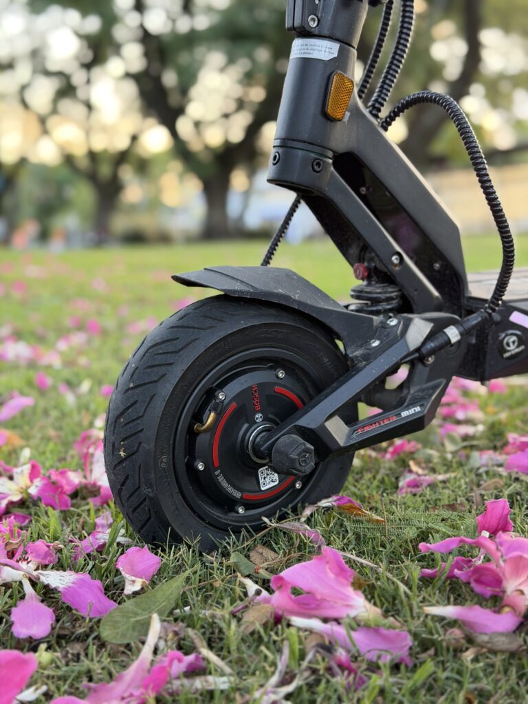 Acá el Teverun tiene uno de sus puntos más fuertes: la suspensión. La suspensión hidráulica regulable (KK) es, sin exagerar, de las más cómodas que probamos en el blog. Filtra muy bien las imperfecciones de la calle y te da una sensación de “monopatín grande”, incluso cuando el formato no es gigantesco. En ciudad, donde tenés asfalto roto, empedrados, parches y lomos, esto se disfruta muchísimo.